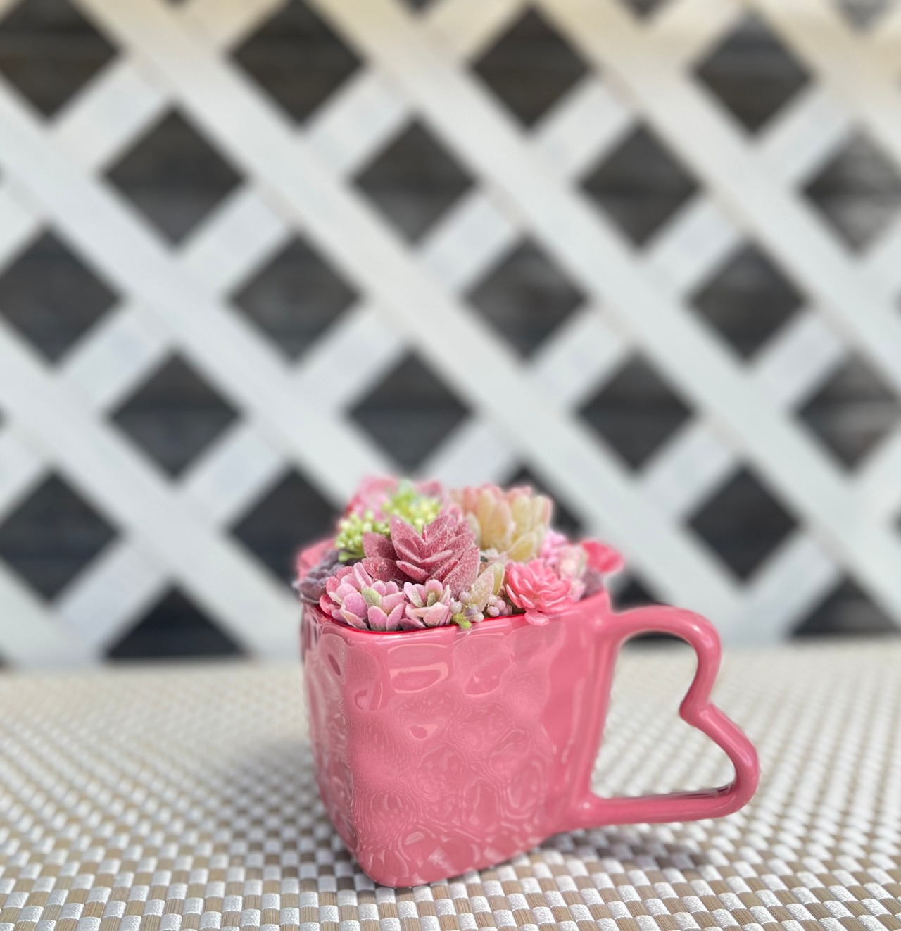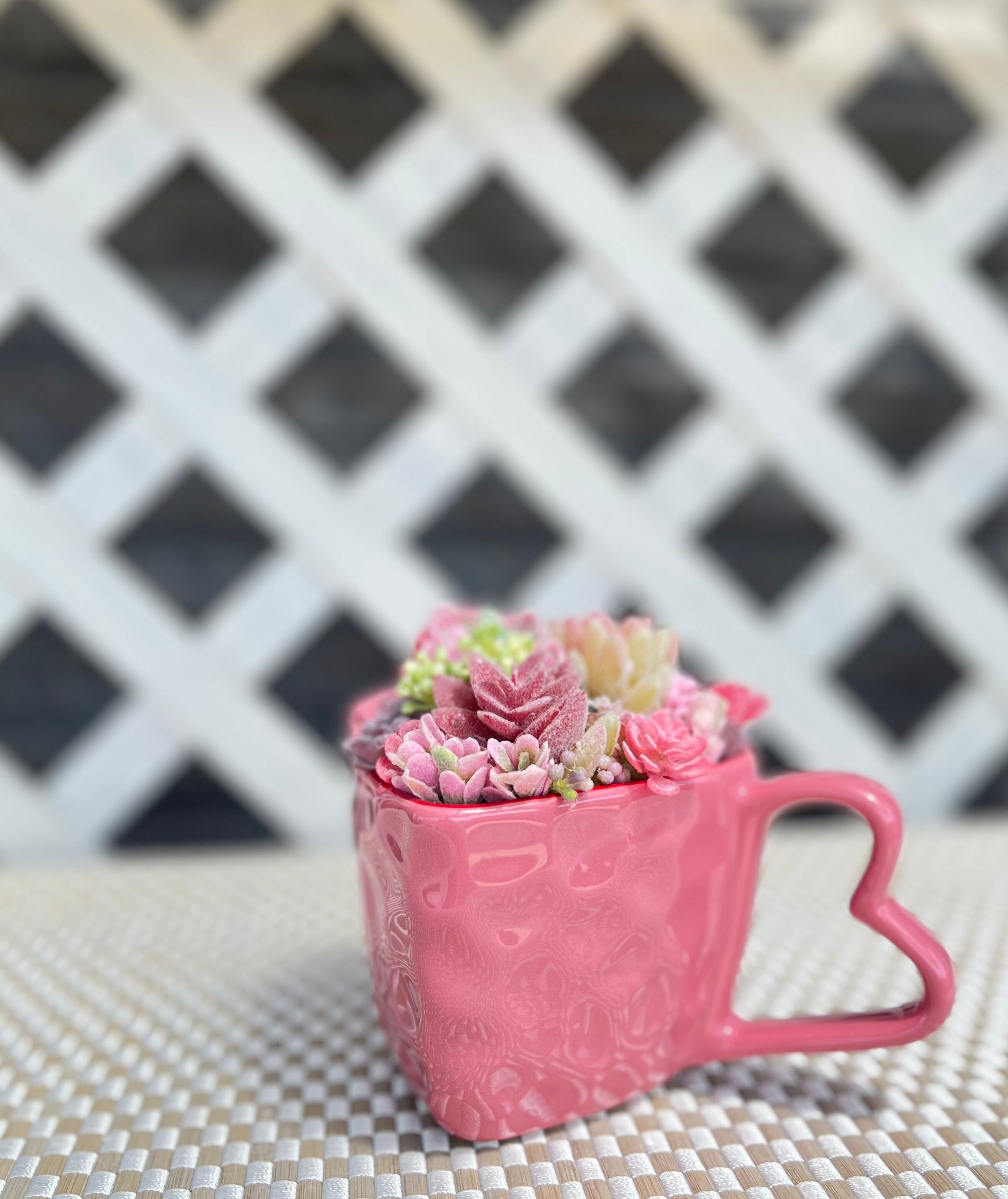 鮮やかなピンクが目を引く多肉植物は、華やかなハート型カップに仕立てられています。インテリアに最適なアイテムです!